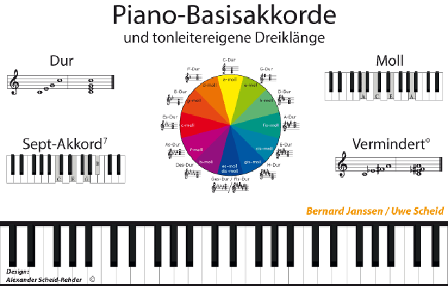 Akkordaufsteller für Klavier Für das freie Klavierspiel ohne Noten oder das Spielen nach Leadsheets ist die Kenntnis der Akkorde und der Akkordsymbolik unerlässlich. Dieser Aufsteller, den Sie bequem auf ihr Piano oder Keyboard stellen können, stellt Ihnen die 4 wichtigsten Akkorde mit ihrer Akkordsymbolik in Notation und Tastatur in allen 12 Tonarten vor. Durakkord, Mollakkord, Septakkord und verminderter Akkord sind die Basisakkorde des freien Klavierspiels. Üben Sie die Akkorde auch in ihren Akkordumkehrungen. Bernard Janssen / Uwe Scheid